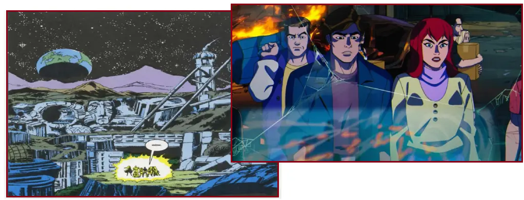 Meanwhile, back on Earth, a few New Yorkers pause their hustle to catch the lunar showdown on TV. Among them are Flash Thompson, Peter Parker, and Mary Jane Watson, giving us a nudge and a wink that Spider-Man has indeed found his lady love after his multiverse-hopping quest in the Spider-Man animated series’ finale, Farewell, Spider-Man. At this rate, we’ll be scraping the bottom of the X-Men episode barrel soon! An idea begins to form…