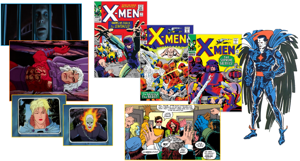 In the first X-Men movie, Magneto kidnaps Senator Kelly for a seemingly benevolent reason. A flashback to the events of Days of Future Past (Part 2) has been edited to include Magneto in the background of scenes from that episode. When the X-Men find Magneto, the amount of blood displayed is surprising for a Saturday morning cartoon.