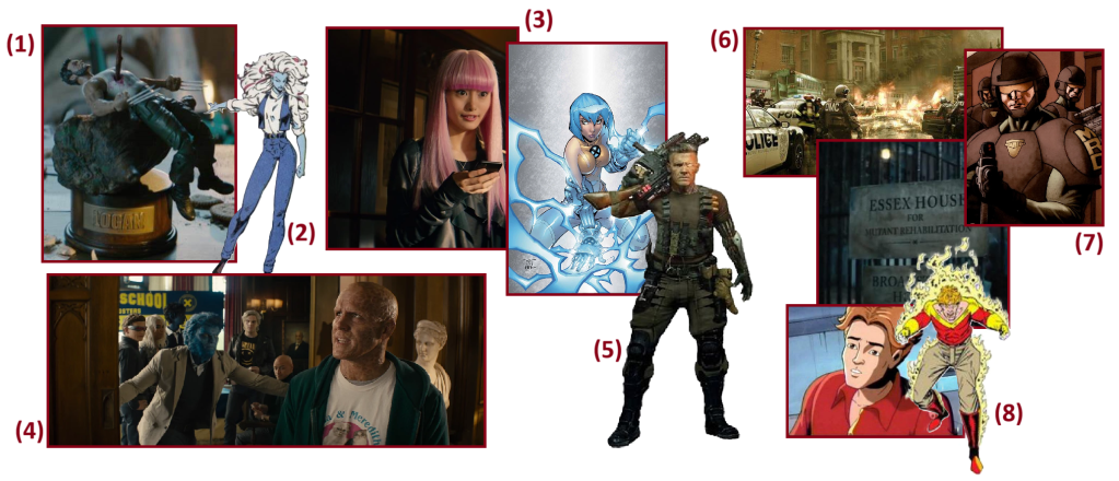 (4) While using Xavier’s wheelchair to explore the mansion, Deadpool complains about the lack of X-Men. He refers to Angel as ‘pigeon wings’ and, in a brief moment, the X-Men team from Dark Phoenix (Charles, Beast, Quicksilver, Nightcrawler, Cyclops and Storm) pull a door closed to avoid him. He also plays with the Cerebro helmet and claims it smells like Patrick Stewart.