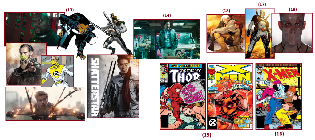 (13) The auditionees for X-Force are all from the comics. Bedlam first appeared in X-Force #82; Zeitgeist, acid vomit and all is from the celebrity-parody X-Statix; Shatterstar, who hails from the interdimensional Mojoverse, also first appeared in New Mutants #98, alongside Wade; The Vanisher, from Uncanny X-Men #2 makes a small unseen appearance – played by Brad Pitt.