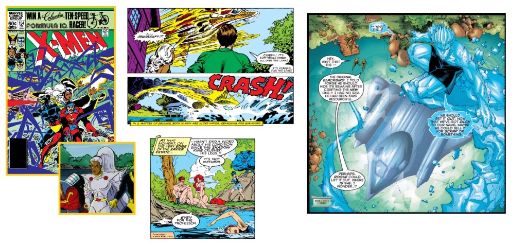 The Starjammer crashes into Breakstone Lake, a well used summer spot the X-Men picnic at in X-Men #8 and conceal a Blackbird in in Uncanny X-Men #353!
