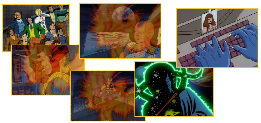 In the comics the planet D’Bari is inhabited. Dark Phoenix also destroys the Shi’ar vessel in the process. In the episode, it’s established by the (very-Spock like) lieutenant that the system is already dead and Dark Phoenix merely cripples the vessel – a good thing, since the background artists have put the Imperial Guard in the background of the scene and they’re needed in the next episode!