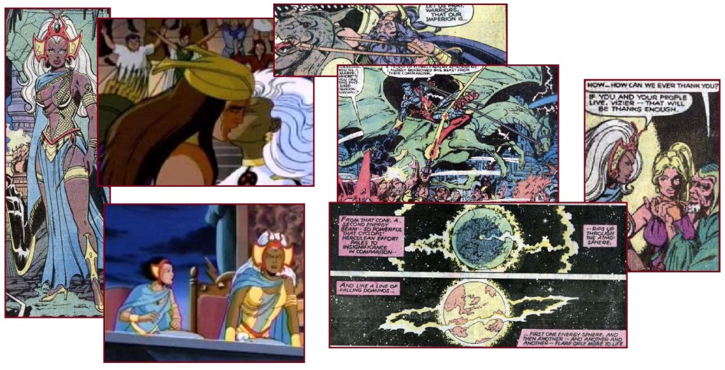 On the planet of Polemachus, the X-Men express their concerns about Storm‘s decision to marry Arkon after knowing him for only a short time. Storm reassures them that this is her choice, as she has seldom been able to make her own significant decisions since becoming an X-Man as a teenager. Meanwhile, Arkon discusses with one of his advisors how he could have simply turned off the energy transmitter instead of seeking help on Earth. It is then revealed that Arkon plans to raid a nearby planet, Belgania, for slave workers.