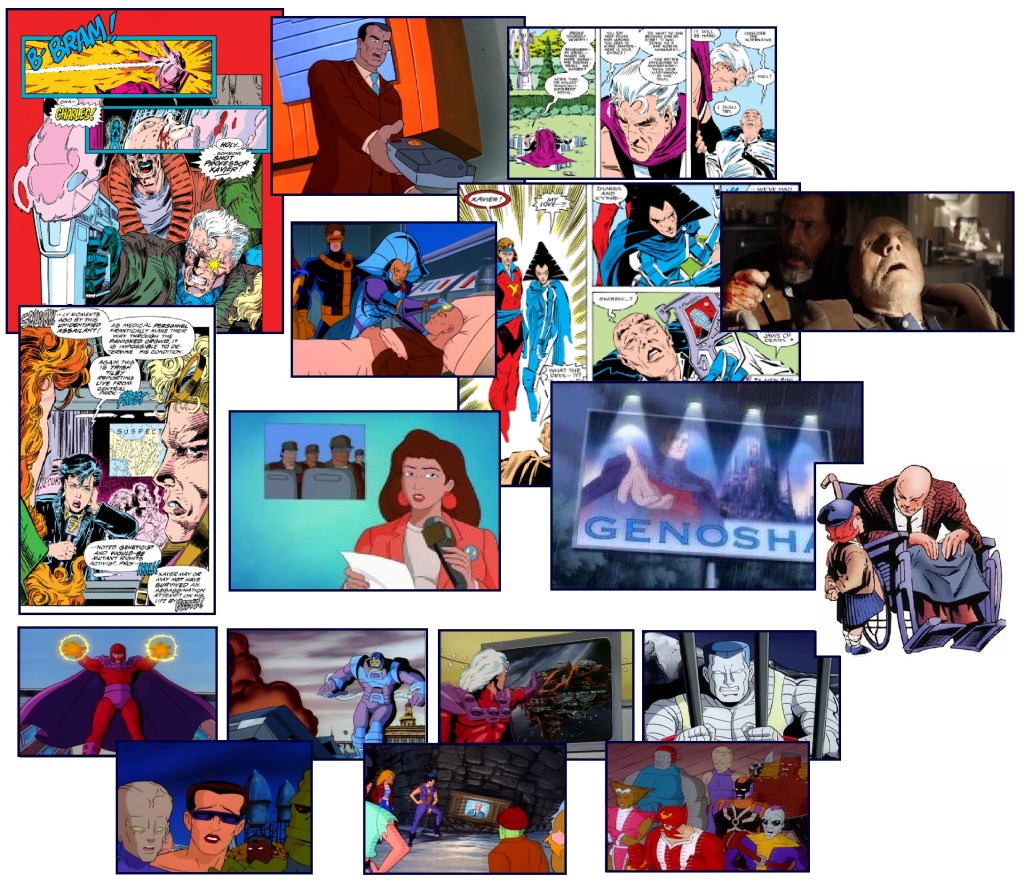 At a press conference, Henry Peter Gyrich tries to push forward a ‘Mutant Containment Bill’ and spread anti-mutant hatred throughout the country. Professor X, already ill from continuously fighting this legislation, arrives to oppose Gyrich’s statement. Gyrich, thinking that Xavier is a mutant, shoots his political enemy with an energy disruptor, causing the Professor’s powers to spin out of control as he collapses unconscious. The X-Men get Xavier onto the Blackbird where Beast examines his body and reveals that their leader is fighting to stay alive.