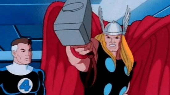 The Thing’s catchphrase from the comics – “What a Revoltin’ Development!” – can be heard for the first time in this episode. His line of the week: “‘I have an idea!’ – The scariest four words in the English language!” Also, he has the nerve to call Thor ‘The Fabio of the Fjords.” He’s also wearing his 80-90’s vest uniform for the first time.