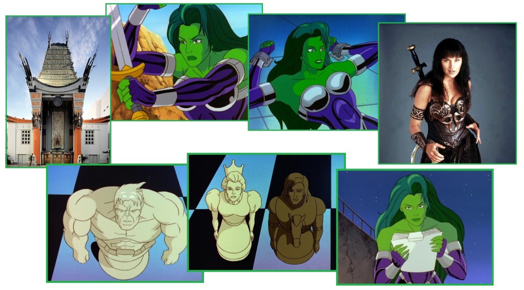 The role She-Hulk takes on resembles Xena: Warrior Princess. She also puts her mark in cement outside the real-life Grauman’s Chinese Theatre on the Hollywood Walk of Fame.