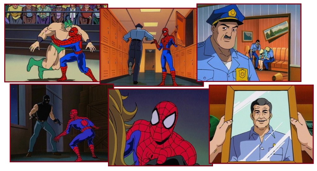 Peter’s origin as Spider-Man, including the murder of his Uncle Ben, is flashbacked to in this episode for the first time. It comes from Amazing Fantasy #15. We’ll see it again in Make a Wish.