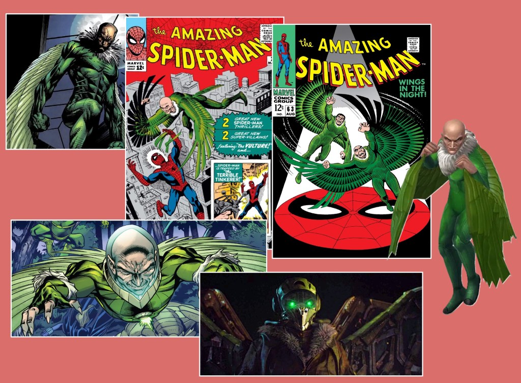 In the comics, the Vulture has remained a recurring adversary for decades, often embodying themes of greed, mortality, and revenge. He has fought Spider-Man countless times, sometimes alone, sometimes as part of villainous teams like the Sinister Six. Toomes’ obsession with youth and vitality became central to his character, with storylines exploring his attempts to drain life energy from others to restore his own. Despite his age, he has proven to be one of Spider-Man’s most enduring enemies, his cunning and ruthlessness ensuring he never fades into irrelevance.