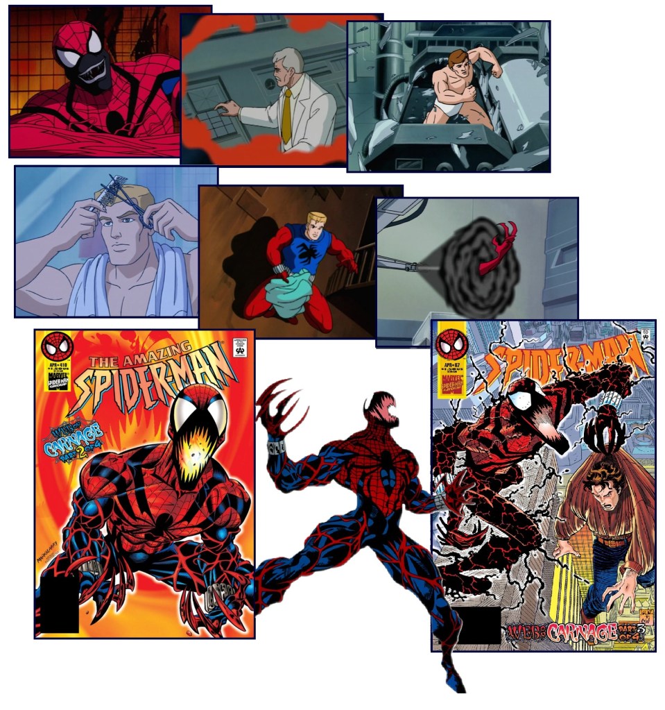 Thematically, the episode explores the idea of doppelgangers — how every choice, every accident, could create a different Spider‑Man. It asks what defines the hero: is it his powers, his science, his courage, or his humanity? Against them stands Spider‑Carnage, a twisted reflection of Peter consumed by the Carnage symbiote, proving that the same foundation can lead to ruin if corrupted.