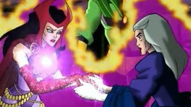 Wanda and the Vision travel to Agatha’s secluded home, only to witness her abduction by her son, Nicholas Scratch, and the Salem Seven. Wanda calls for the Avengers, but they are already locked in pursuit of the Grim Reaper. Vision, however, refuses to abandon her. Together with Agatha’s familiar, Ebony, they journey to New Salem, where the Salem Seven overpower them and Vakume drains the Vision of his energy. Scratch places Agatha on trial, accusing her of betraying her lineage by teaching a mutant instead of her own blood. The Seven condemn her.